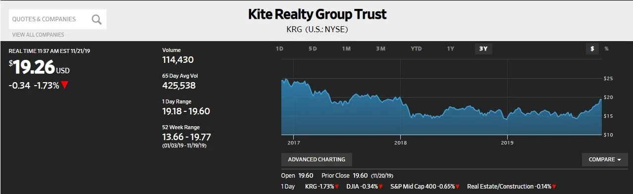 Kite Realty Group Trust. Courtesy of Wall Street Journal. Represents a decline in value of 20.9% from 11/19/16 through 11/19/19.