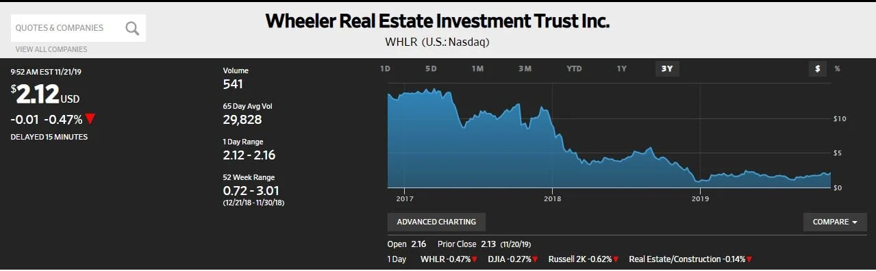Wheeler Real Estate Investment Trust, Inc. Courtesy of Wall Street Journal.Represents a decline in value of 84.3% from 11/19/16 through 11/19/19.