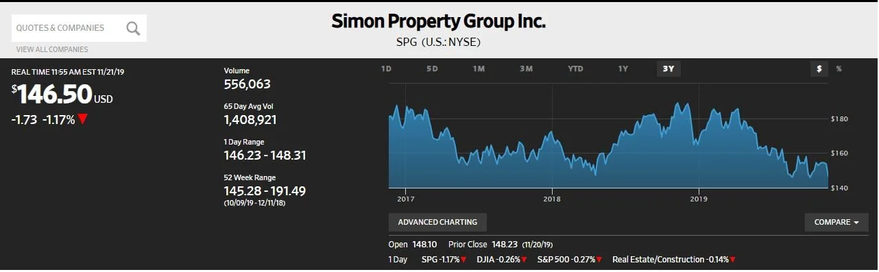 Simon Property Group, Inc. Courtesy of Wall Street Journal. Represents a decline in value of 18.8% from 11/19/16 through 11/19/19.