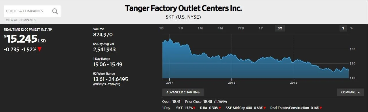 Tanger Factory Outlet Centers, Inc. Courtesy of Wall Street Journal. Represents a decline in value of 55.8% from 11/19/16 through 11/19/19.
