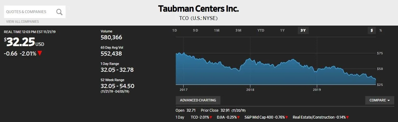 Taubman Centers, Inc. Courtesy of Wall Street Journal. Represents a decline in value of 56.3% from 11/19/16 through 11/19/19.