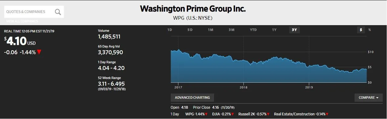 Washington Prime Group, Inc. Courtesy of Wall Street Journal. Represents a decline in value of 59.8% from 11/19/16 through 11/19/19.