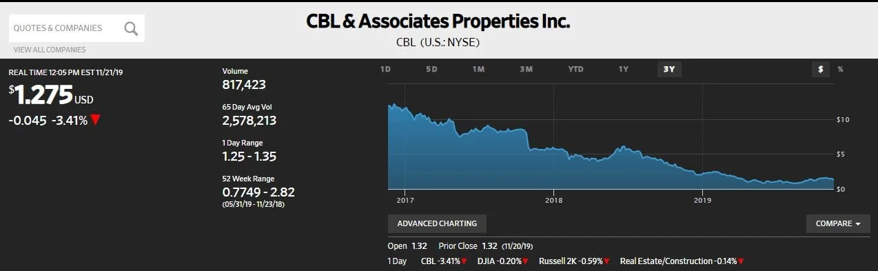 CBL & Associates Properties, Inc. Courtesy of Wall Street Journal. Represents a decline in value of 89.9% from 11/19/16 through 11/19/19.