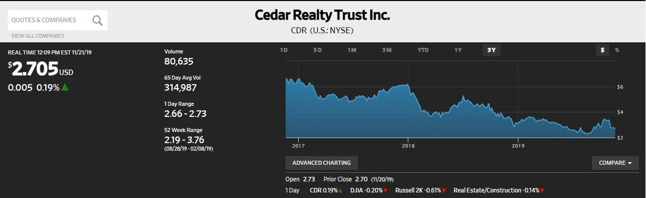 Cedar Realty Trust, Inc. Courtesy of Wall Street Journal. Represents a decline in value of 59.1% from 11/19/16 through 11/19/19.