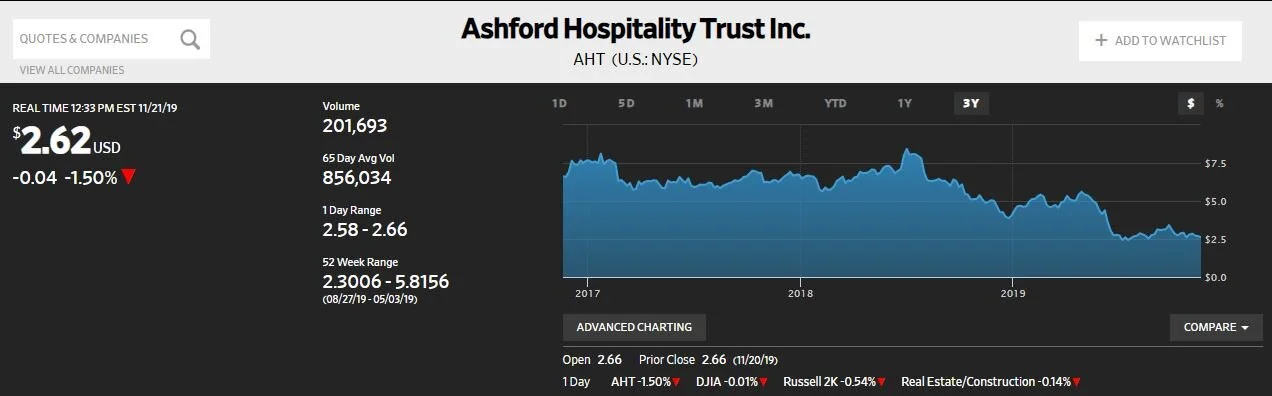 Ashford Hospitality Trust, Inc. Courtesy of Wall Street Journal. Represents a decline in value of 60.6% from 11/19/16 through 11/19/19
